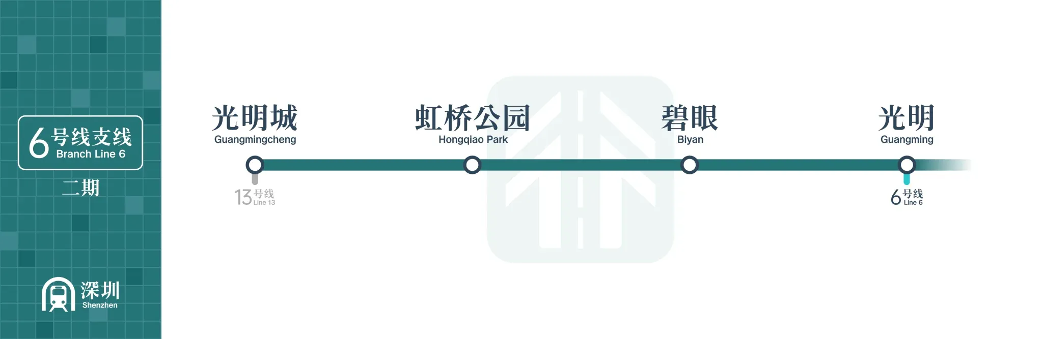 The Phase II project of the Branch Line 6 starts from the existing Guangming Station of the Line 6 extension, with 3 new stations: Biyan Station, Hongqiao Park Station, and Guangmingcheng Station, covering a total length of about 4.95 kilometers.
