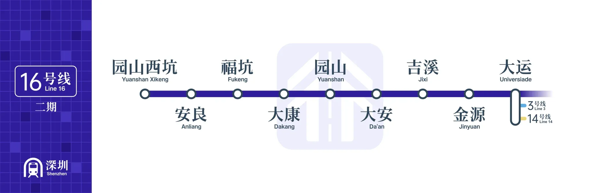 The Phase II project of Line 16 starts from the existing Dayun Station of Line 16, with 8 new stations: Jinyuan Station, Jixi Station, Da'an Station, Yuanshan Station, Dakang Station, Fukeng Station, Anliang Station, and Yuanshan Xikeng Station, covering a total length of about 9.54 kilometers.