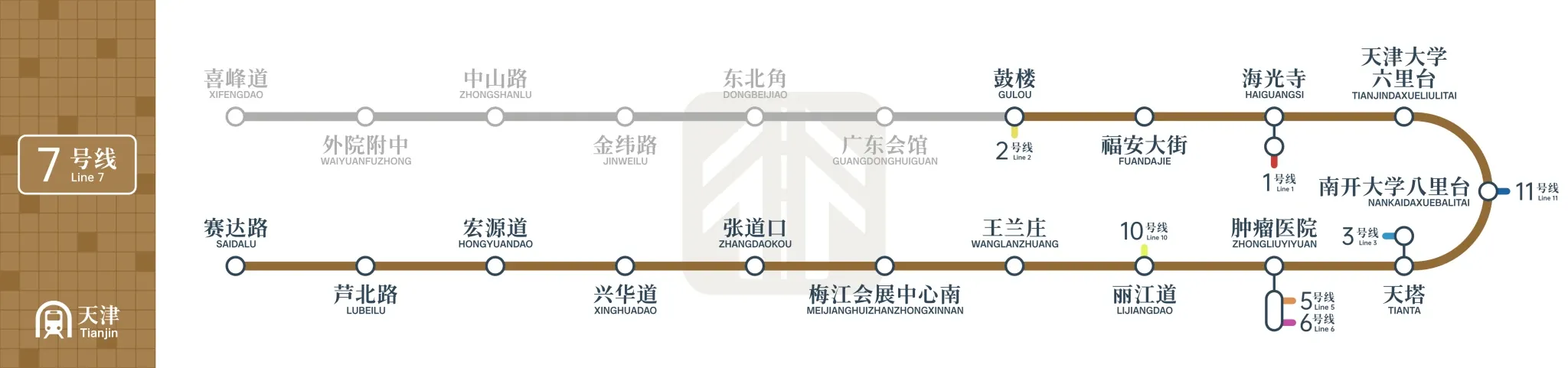 The southern section of Tianjin Metro Line 7 consists of 15 stations: Saida Road Station, Lubei Road Station, Hongyuan Road Station, Xinghua Road Station, Zhangdaokou Station, Meijiang Convention and Exhibition Center South Station, Wanglanzhuang Station, Lijiang Road Station, Cancer Hospital Station, Tian Ta Station, Nankai University Balitai Station, Tianjin University Liulitai Station, Haiguang Temple Station, Fuan Street Station, Drum Tower Station, with a newly constructed length of 21.82 kilometers.