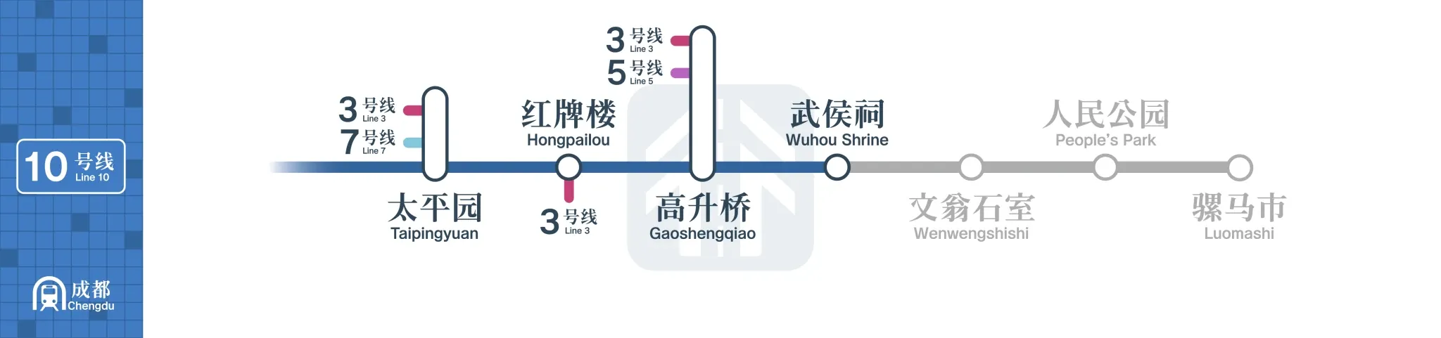 The third phase of Line 10 is an extension of the first and second phases of Line 10, starting from Renmin Park Station and ending at Taipingyuan Station, with a total length of 5.87 kilometers. The third phase of Line 10 will operate from Wuhouci Station to Taipingyuan Station, allowing transfers to Lines 3 and 5. The remaining two stations (Wenweng Shishu and Renmin Park Station) will open as soon as they meet the opening conditions. After the opening of the operational range of the third phase of Line 10, the entire line will operate on a large-small loop from Wuhouci Station to Xiping Station and from Wuhouci Station to Huaqiao Station.
