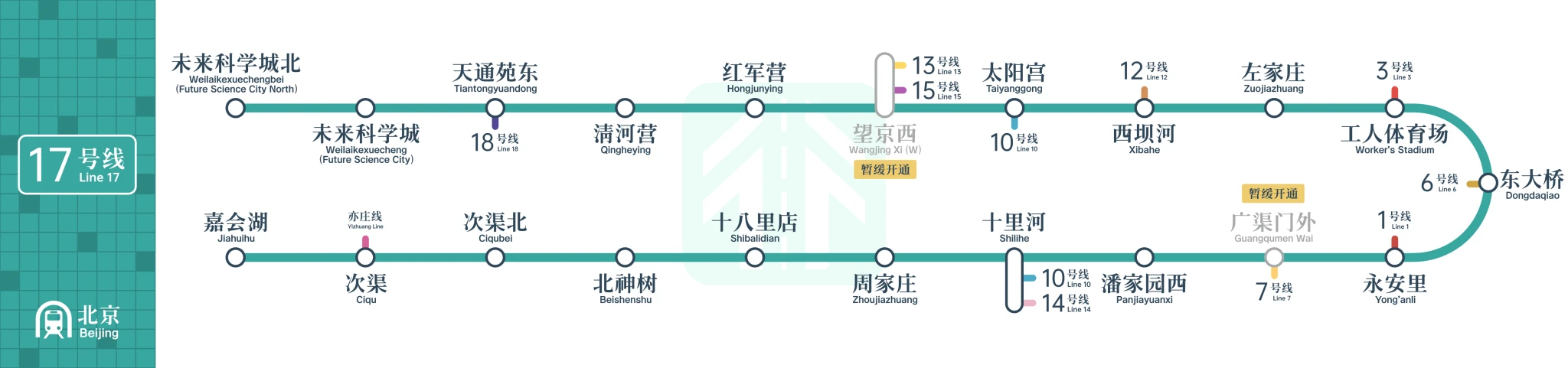 17號線是一條貫穿北京城區南北的大運量軌道交通幹線,此前南段(嘉會湖—十里河)和北段(工人體育場—未來科學城北)已分段開通,此次開通的中段(十里河—工人體育場)全長8.2公里,共設4座車站,其中2座換乘站,東大橋站可換乘6號線,永安里站可換乘1號線,廣渠門外站因一體化建設暫緩開通。