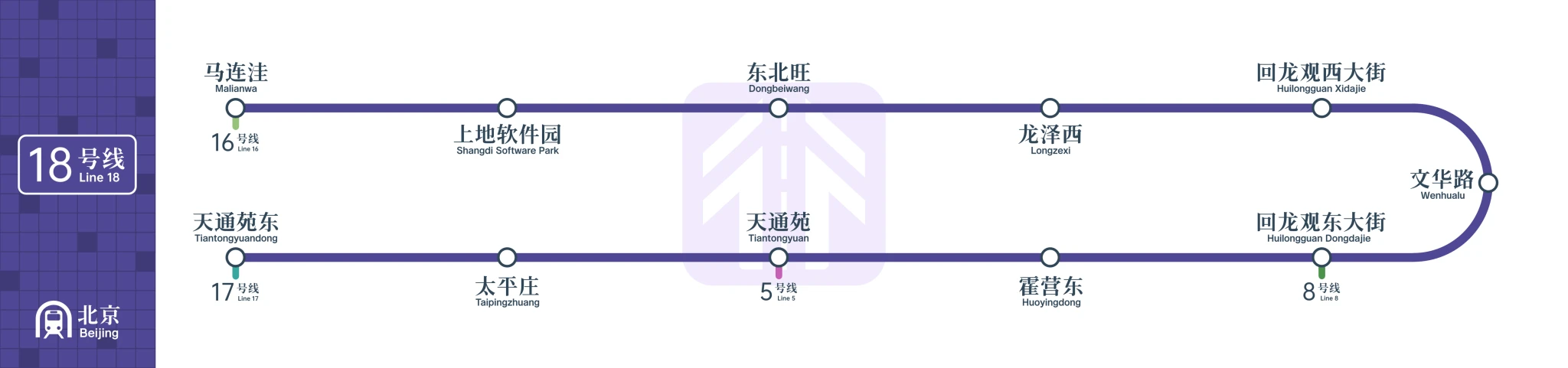 18號線是北京城市北部地區東西向骨幹線路,此次開通馬連窪站至天通苑東站段,是13號線擴能提升工程的一部分,途經海淀、昌平兩區,全長約19.8公里,共設車站11座。