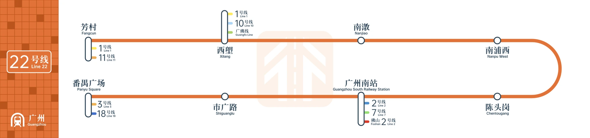22号线全长29.7公里,线路定位为时速160公里的南站快线。其中,该线后通段(陈头岗-芳村)全长11.5公里,自南向北设南浦西、南漖、西塱和芳村4座车站,西塱站可换乘1号线、10号线、广佛线,芳村站可换乘1号线、11号线。
