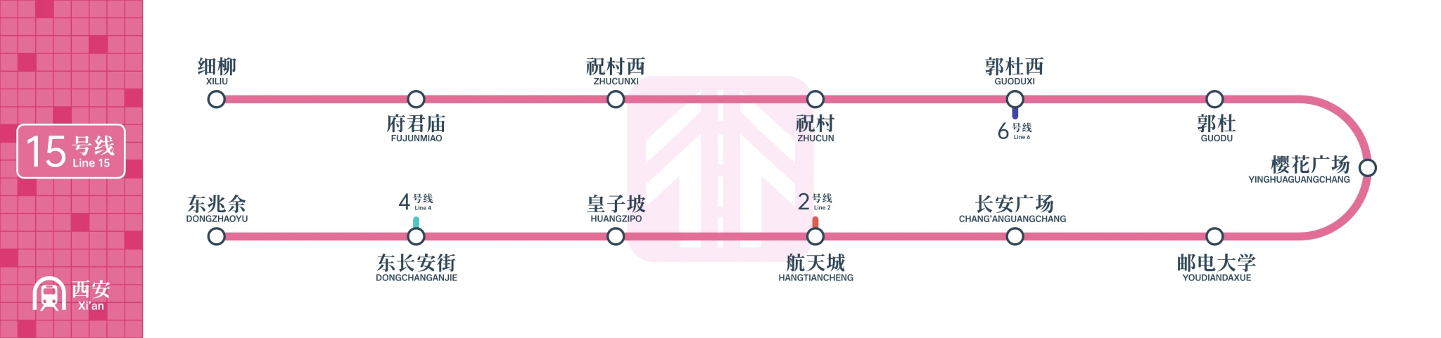 15号线全长19.4公里,均为地下站,共设13座车站,其中换乘站3座,可与现有2、4、6号线实现换乘。该线路为GoA4级全自动运行线路,并采用4节和6节编组A型列车混跑模式,列车最高时速可达100千米。